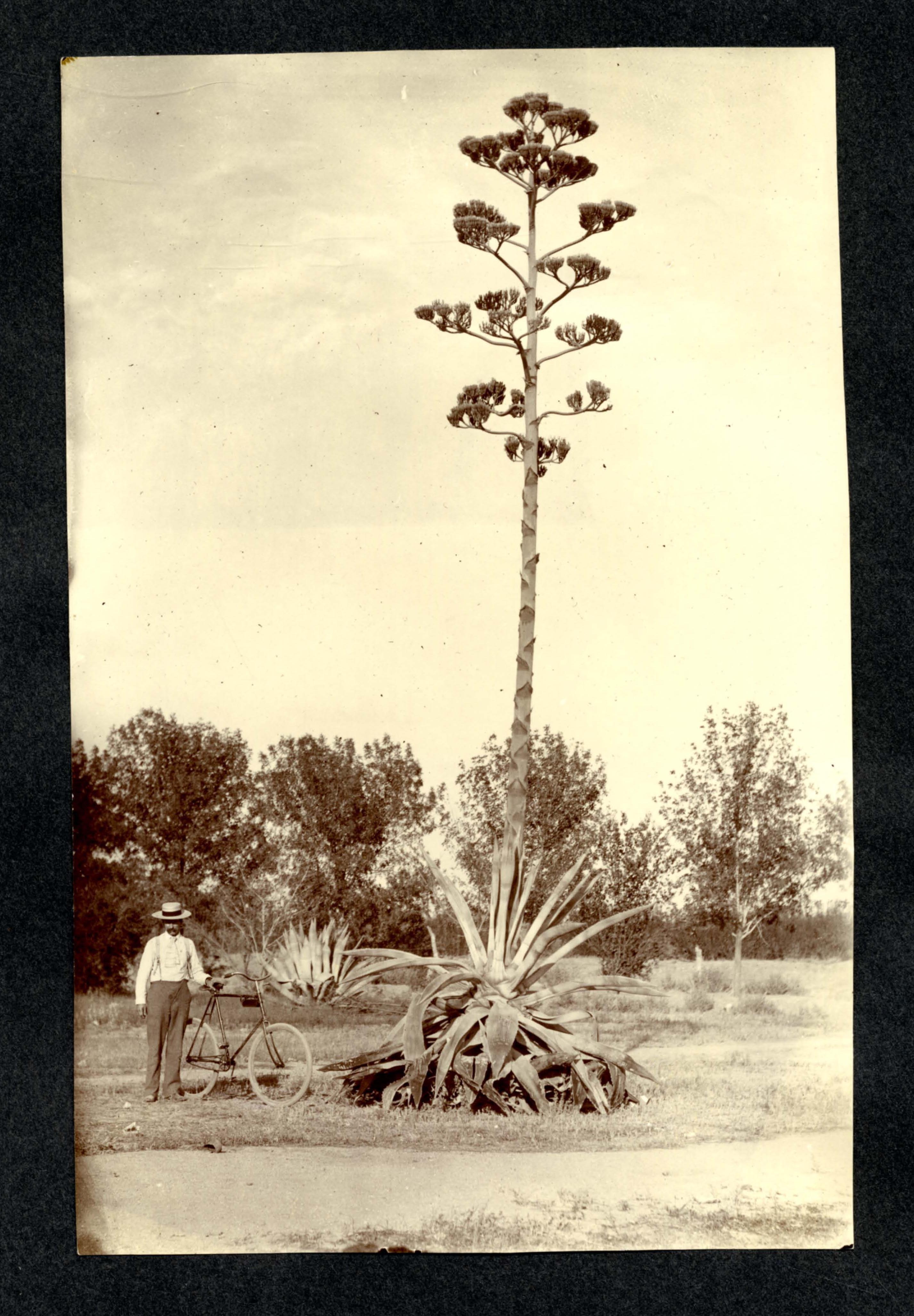 Subject: Man standing next to a towering Century Plant (Agave).