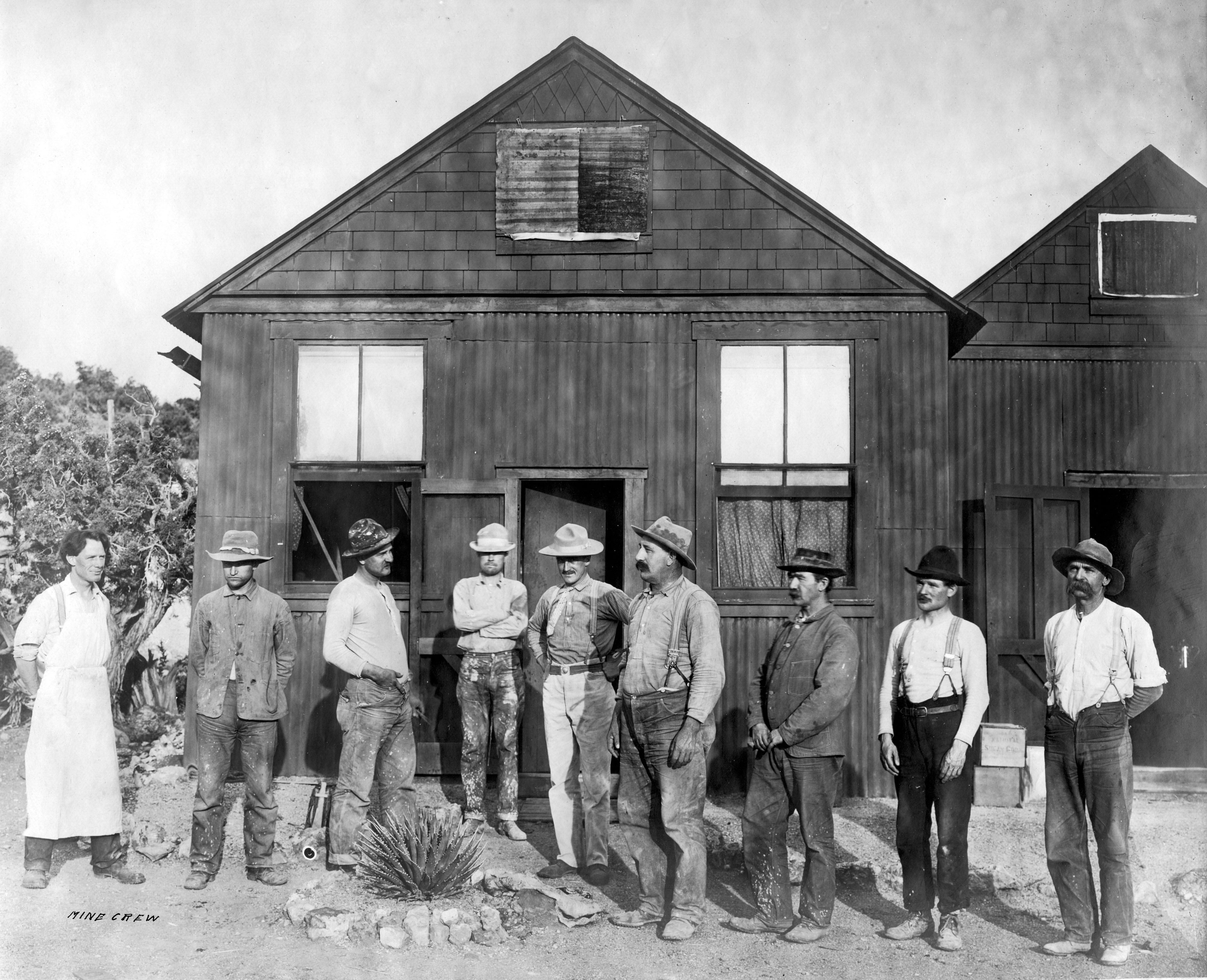 Subject: Mine crew of nine men in front of a Canyon Copper Co. building, Horseshoe Mesa, Grandview.