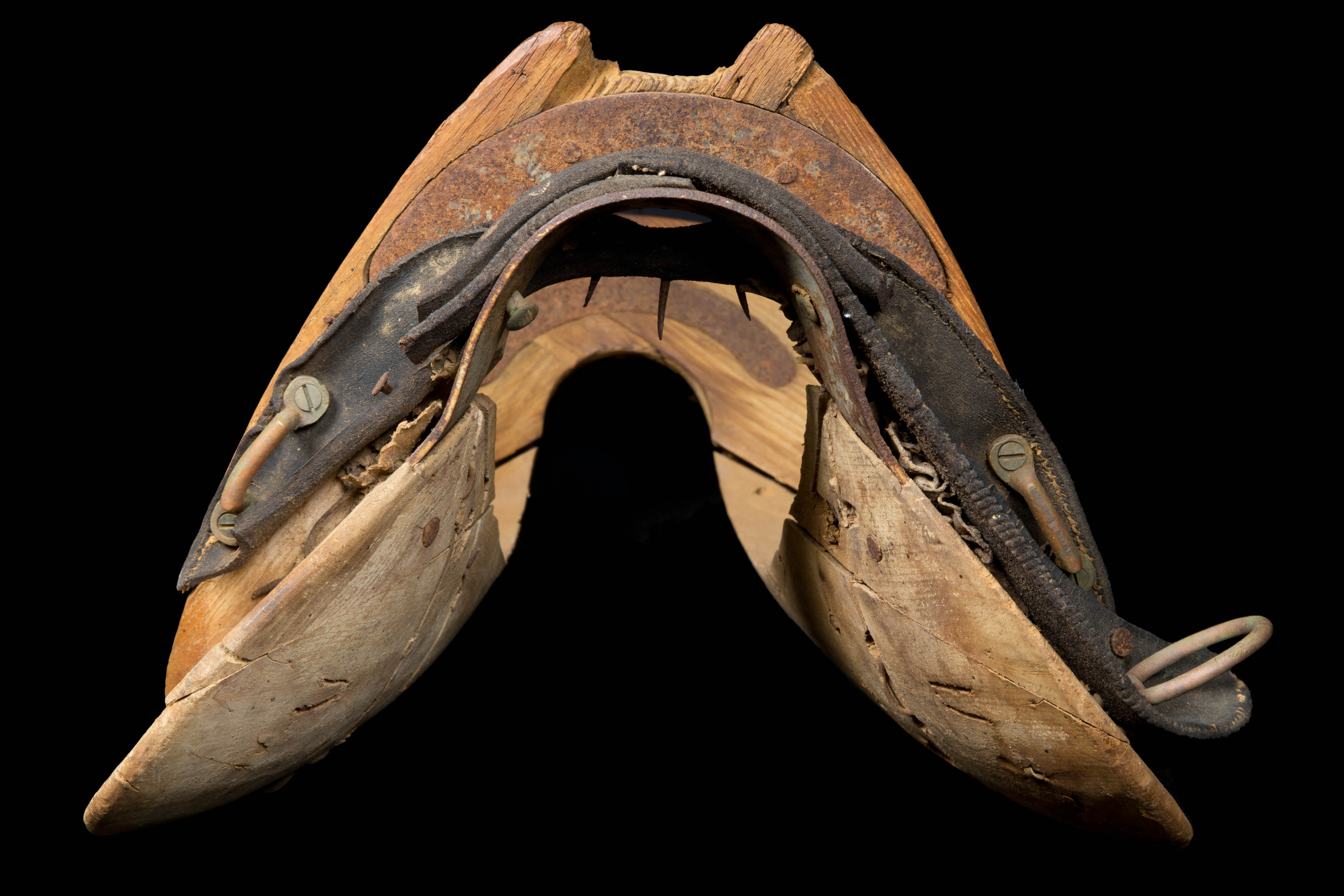 Description: "McClellan Army" riding saddle found in prospector Ben Beamer's cabin. Wood with metal and some leather pieces intact.