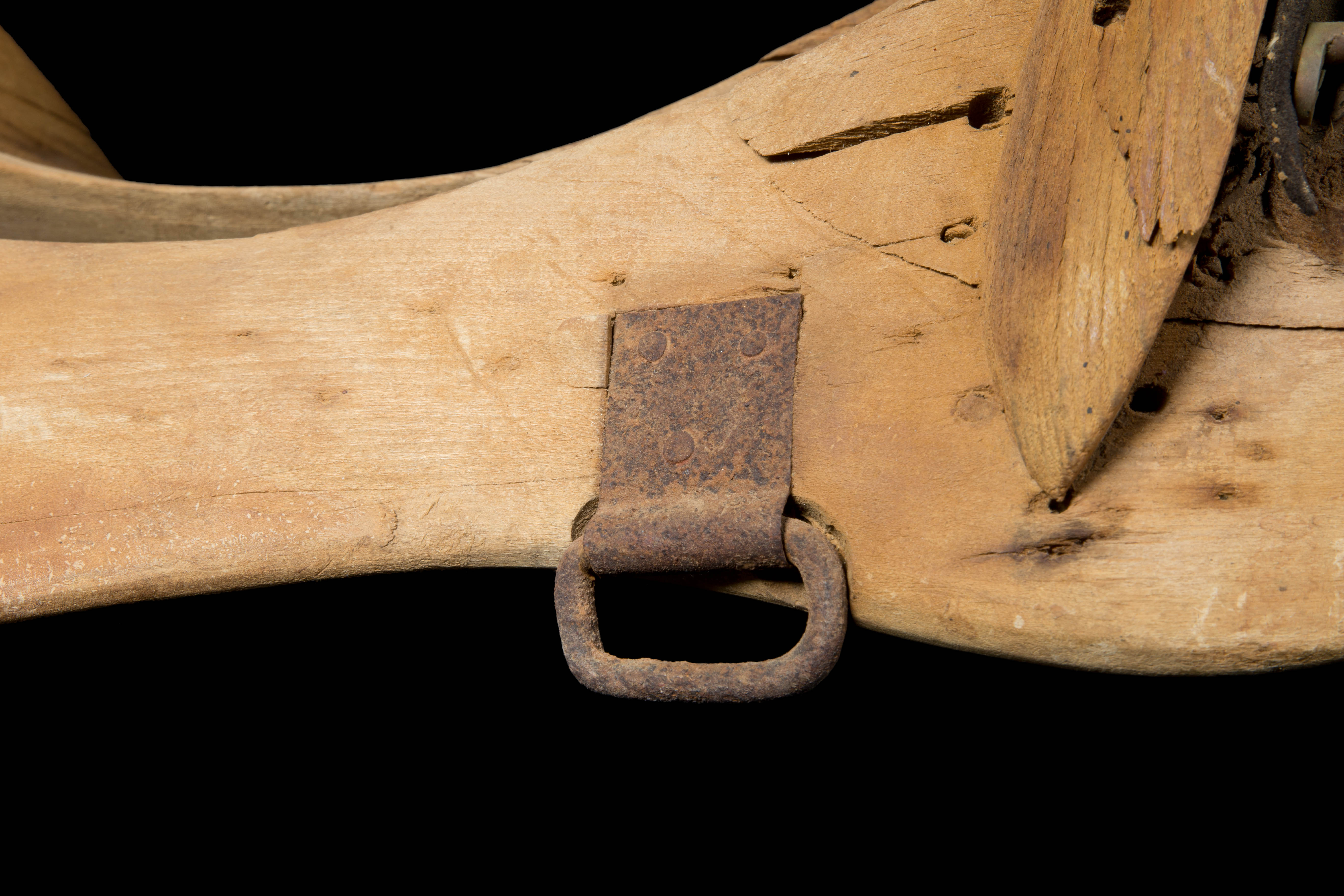Description: "McClellan Army" riding saddle found in prospector Ben Beamer's cabin. Wood with metal and some leather pieces intact.